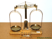 1 Stativåg av mässing monterad på träskivasamt viktsats (några mindre vikter saknas)