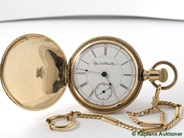 ELGIN WATCH CO. fickur, 55 mm, Serie nr. 4936693, Boett nr. 3046636, savonett, doublé, ankarur, skadad urtavla, skadad boett, kedja doublé, läderpåse, ca 1893.