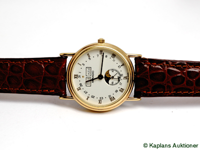 MOVADO, damur, 28 mm, Ref nr. 87-27-822, Serie nr. 975914, doublé, quartz, safirglas, dag, datum, månad, månfas, läderband, originalspänne, ca 1996.