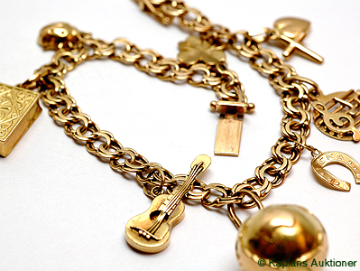 1 Armband med 8 berlocker (vissa berlocker buckliga), ca 18cm, 18K. Vikt 21,2g