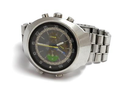 OMEGA, Flightmaster, Cal 910, Serie nr. 29133655, Ref nr. ST 145.0013, Boett nr. 145.013, kronograf, herrur, 43 x 52 mm, stål, manuell, mineralglas, 24-timmarsvisning, GMT-visning, skadad urtavla (4/10), originallänk, viklås, Ref nr. 1159/155, ca 1969.