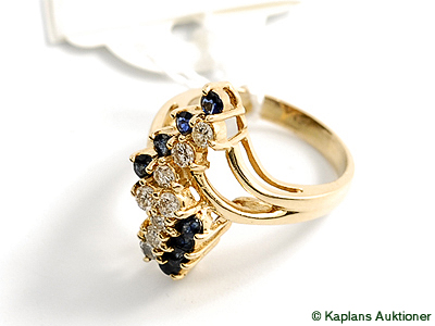 1 Ring 14K, med blå stenar & diamanter ca 8x0,05ct, Stl: 16 3/4. Vikt 5,5g