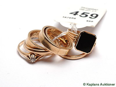 7 Ringar 18K, (graverade, buckliga, varav 2 med stenar). Vikt 26,8g