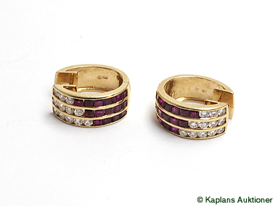 ÖRHÄNGEN, 18K guld med rubiner och 24 briljanter ca 1,00 ctv TW(G)/VS-SI, sten med nagg, vikt 10,4 g, stift, " huggies ".
