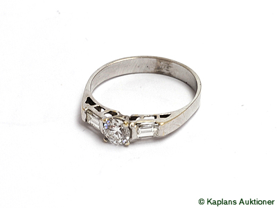 RING, 14K guld, rodierat, briljant ca 0,30 ct ca TW(G)/SI2, 2 baguetter ca 0,30 ctv ca W(H)/VS, 1 baguette lös i fattningen, stl 16,5 mm.