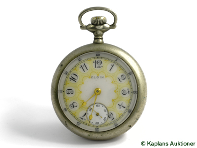 ELGIN, fickur, 54 mm, Serie nr. 24517637, Boett nr. 360678, vitmetall, skadad urtavla, defekt, motiv (lok), ca 1910.