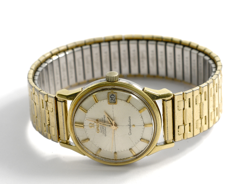 OMEGA, Constellation, Calendar, Chronometer, sk. "Pie-pan", Cal 561, Serie nr. 24440918, Ref nr. CD 168.0005, Boett nr. 168.005, herrur, 34,2 mm, guld på stål, automatisk, plexiglas, datum, skadad urtavla, ca 1966, metallänk ej original.
