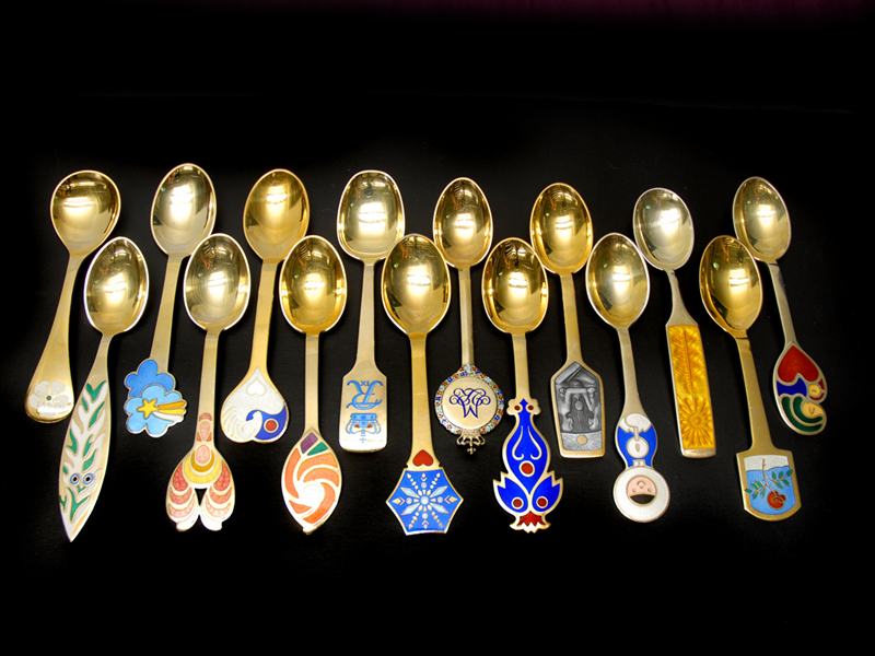 15 SKEDAR, förgyllt sterling silver med emalj, 14 julskedar av A. Michelsen och 1 årssked av Georg Jensen.