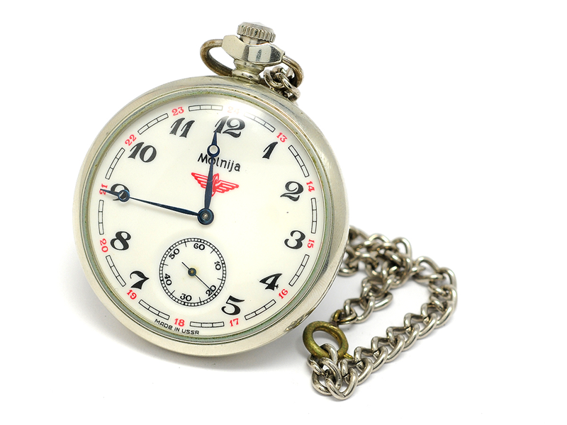 MOLNIJA, fickur, 52 mm, Cal 3602, Serie nr. 497005, vitmetall, ankargång, motiv (lokomotiv), ca 1970, kedja vitmetall, läderpåse.