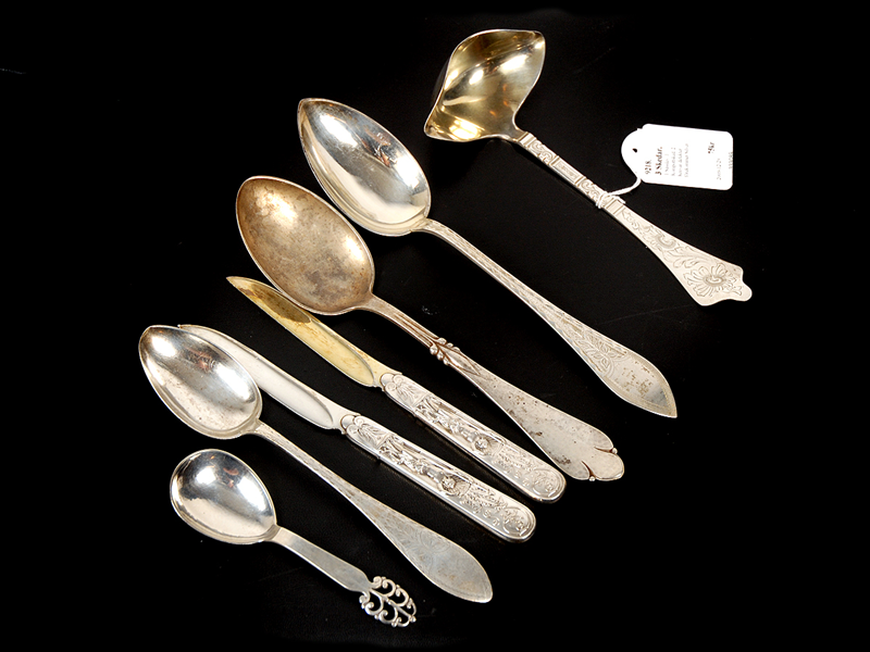 3 Skedar, 1 Såsslev, 1 Kompottsked, 2 Knivar defekter förekommer Silver