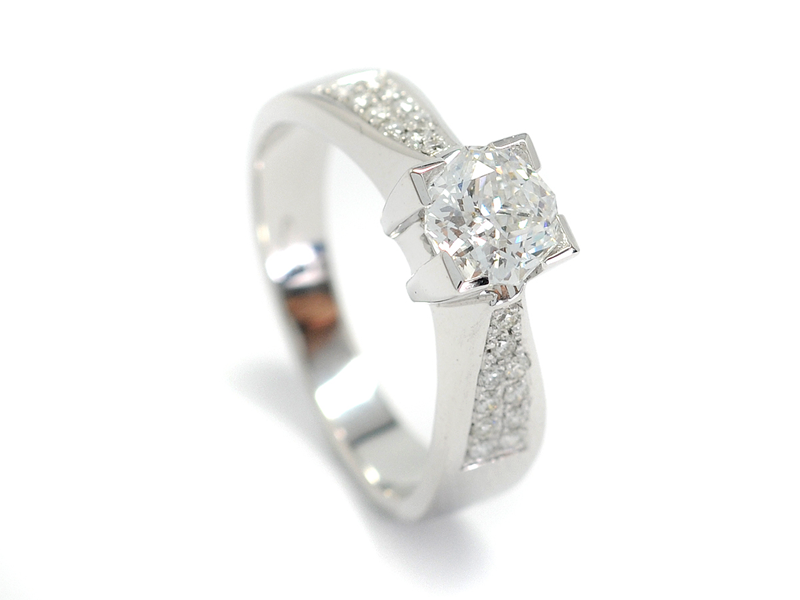 RING, 18K vitguld, radiantslipad diamant 1,07 ct, River(E)/VS2, minireport från HRD, 20 mindre briljanter ca TW-W/VS, stl 17,75+ mm, vikt 6,2 g.