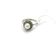 Ring, vitguld med pärla och gröna stenar Ø16 18K 3,2 g
