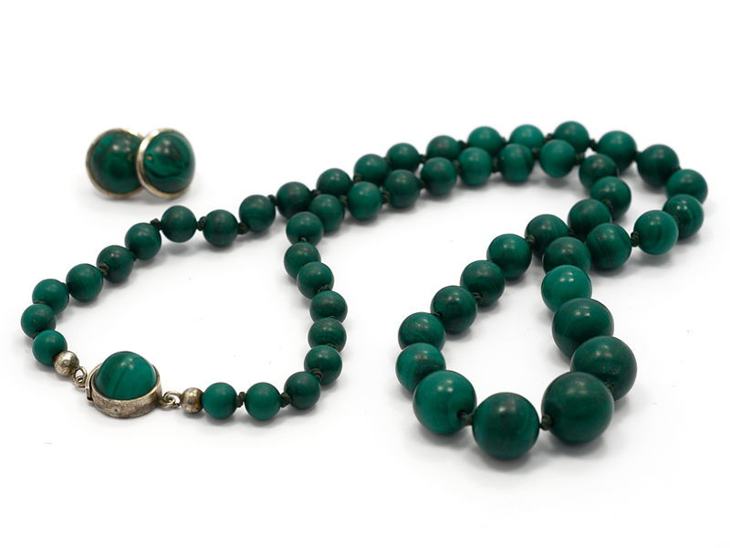 COLLIER/ÖRHÄNGEN, gröna malakitkulor, 5,6 -11 mm, längd 47 cm, silverlås, collieret stämplat Hansen, Stockholm 1964, stift.