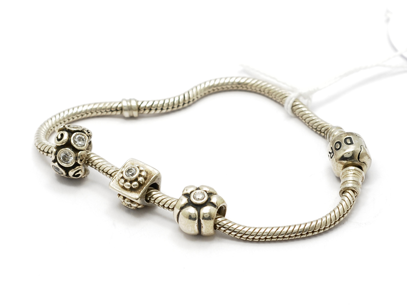 Armband, Pandora i silver (defekt vid låset) 3 berlocker med stenar 22,9g
