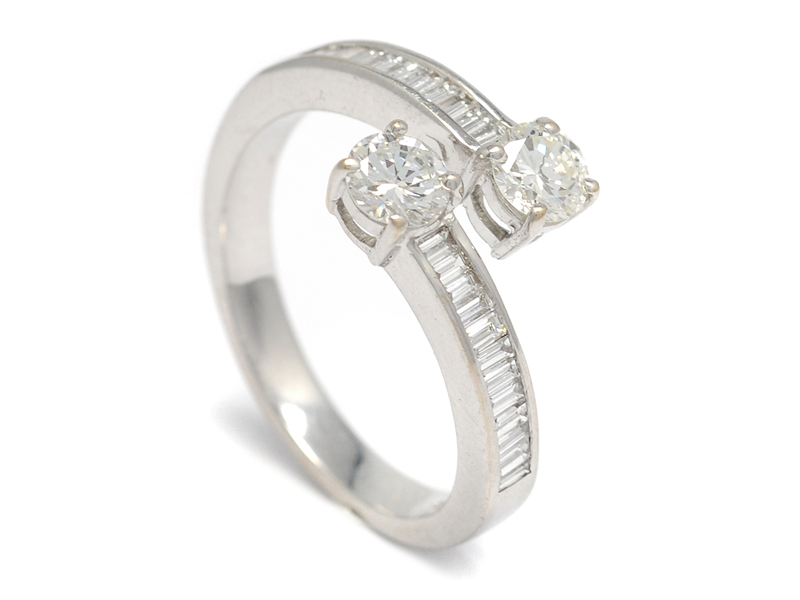RING, 18K vitguld, 2 briljanter ca 0,65 ctv, ca TCR-CR(I-J)/VS1-2, 25 baguetteslipade diamanter ca 0,50 ctv, ca TW/VVS, en baguetteslipad diamant med mindre skada, stl 18 mm, vikt 4,8 g, etui.