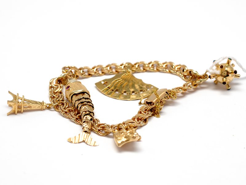 Armband, 18K Bismarck 18.5cm med säkerhetskedja samt 5 berlocker 27,3g