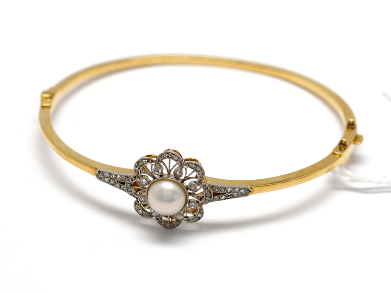 Armring, med pärla och diamanter, äldre slipning, 50xca.0,005ct 18K Ø5-6cm 13,3g