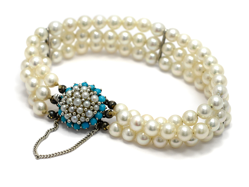 PÄRLARMBAND, odlade pärlor, ca 5,0-5,5 mm, 3-radig, silverlås med turkoser, säkerhetskedja i silver, längd 16 cm.