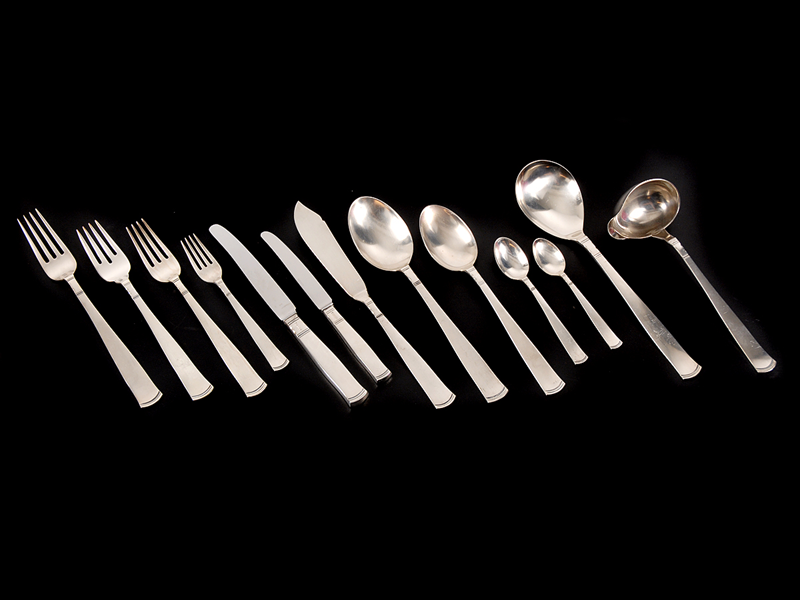 MATSILVER, 113 delar; 12 bordsskedar, 12 bordsgafflar, 12 bordsknivar, 12 fiskknivar, 12 fiskgafflar, 11 kaffeskedar, 12 mockaskedar, 12 smörgåsgafflar, 12 smörgåsknivar, 1 såssked, 1 serveringssked, 2 matgafflar, 2 matknivar, Rosenholm, Guldsmedsaktiebolaget, Stockholm, 1978.