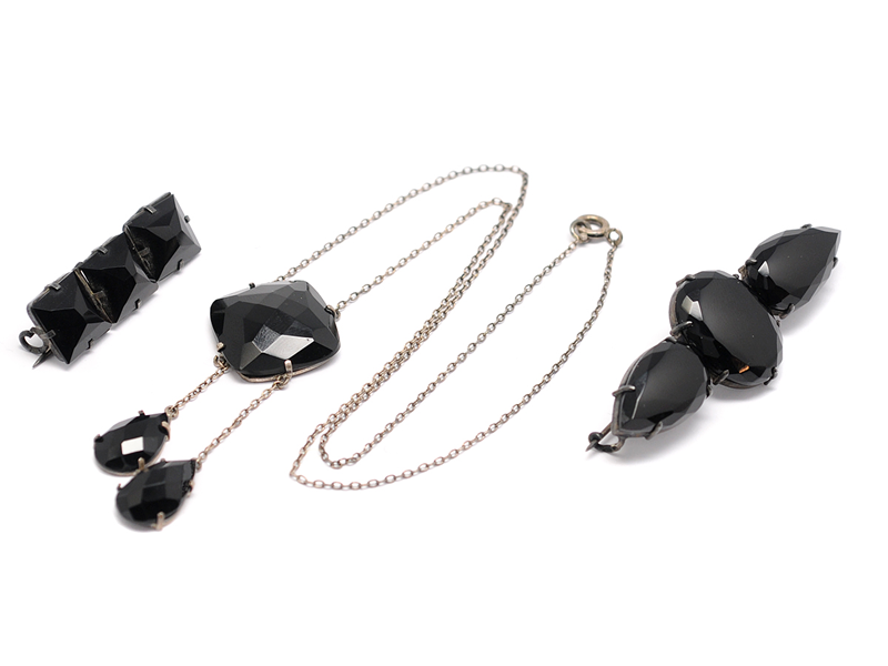3 SORGSMYCKEN, 2 broscher, 1 collier; silver, onyx, kedjelängd 41 cm.