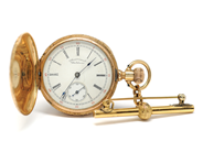 AMERICAN WALTHAM, Watch Co. mormorsur, 39 mm, savonett, Serie nr. 5518557, Boett nr. 354633, 14K guld, ankargång, skadad urtavla, innerlock i 14K guld, motiv, ca 1891, brosch i gulmetall.