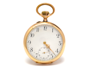 FICKUR, 49 mm, Boett nr. 148764, 18K guld, ankargång, skadad urtavla, motiv "riksvapen", bucklor, ca 1900.