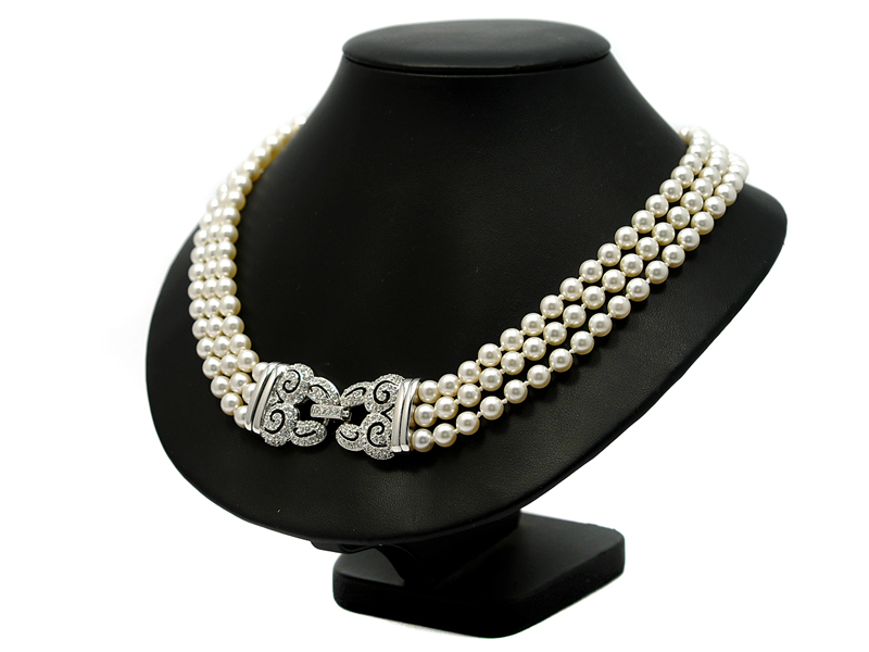 PÄRLCOLLIER, SWAROVSKI 3-radigt, imitationspärlor, rodiumpläterat lås med vita stenar, längd 42 cm, originalask.