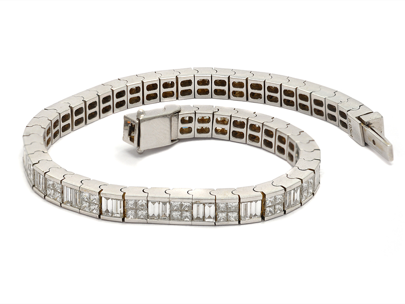 TENNISARMBAND, 18K vitguld, baguette- och prinsesslipade diamanter ca 8,05 ctv enl gravyr, ca W/VS, längd 18,5 cm, vikt 27,1 g.