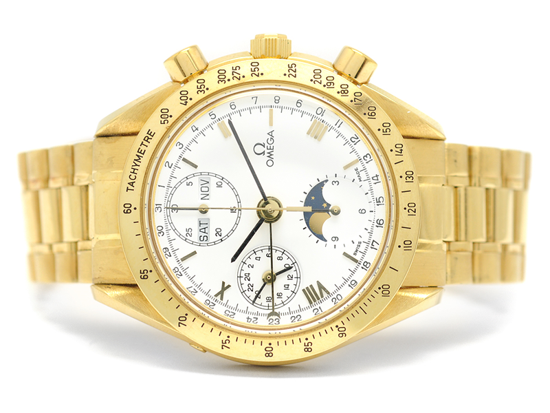 OMEGA, Speedmaster Classic, "Tachymetre", Cal 1150 (Valjoux 7751), Serie nr. 51751586, PIC nr. 3130.20.00, Ref nr. BA 375.0034, Boett nr. BA 175.0034, kronograf, herrur, 39 mm, 18K guld, automatisk, plexiglas, dag, datum, månad, månfas, defekt, originallänk, viklås, Ref nr. 1489/813, cert (ej komplett), ca juli 1991, box, ytterkartong.