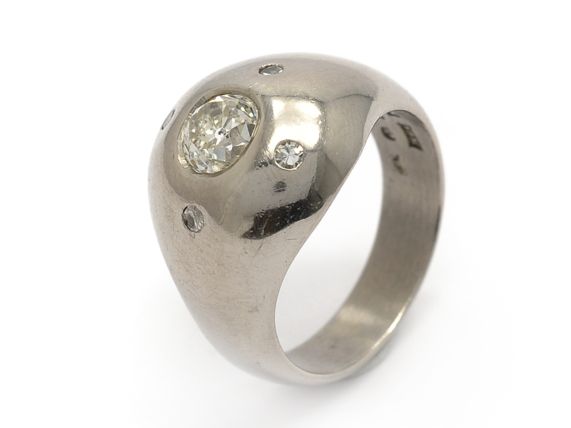 LORDRING, 18K vitguld, gammalslipad diamant ca 0,80 ct, ca TCa(L)/SI2-P1(+), och 4 små åttkantslipade diamanter ca 0,08 ctv (en skadad), stl 19 mm, vikt 20,5 g.