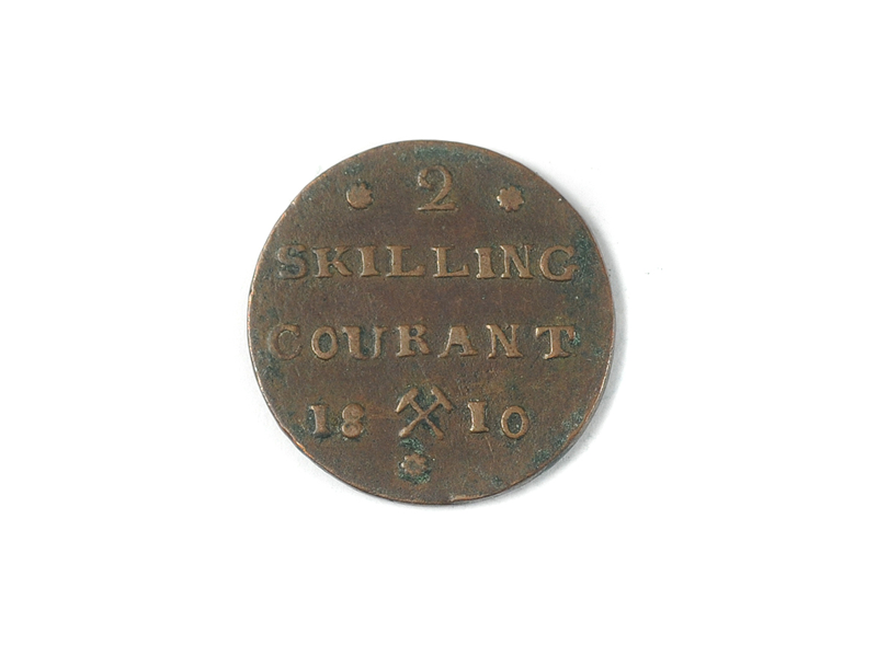 MYNT, koppar, 2 Skilling Courant, Norge, 1810, kvalité ca 1, diameter 28 mm, vikt 8,2 g.