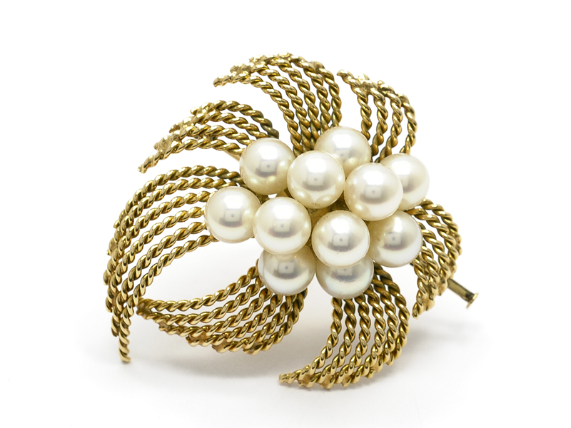 BROSCH, 14K guld, 11 odlade pärlor 6,5-7 mm, vikt 15,1 g.