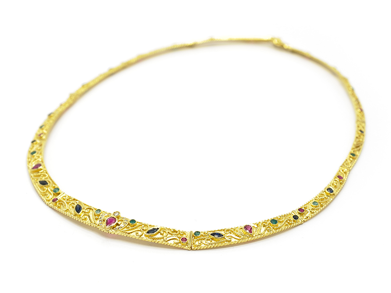 COLLIER, 18K guld, rubiner, smaragder, safirer, 12 åttkantslipade diamanter ca 0,06 ctv, briljant ca 0,04 ct, ca W/VS, vikt 29,7 g, längd 42 cm.