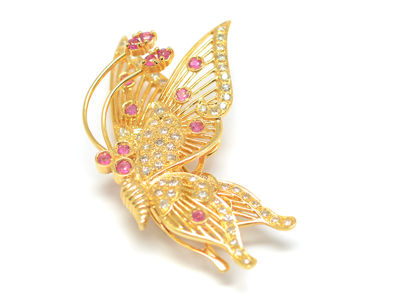 BROSCH, 14K guld, rubiner, diamanter, ca 3 skadade, fjäril, rörlig del, vikt 8,4 g.