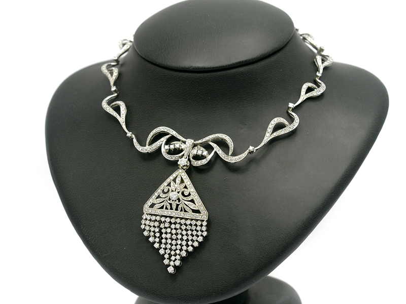 COLLIER OCH HÄNGE, 18K vitguld, ca 230 åttkantslipade diamanter ca 3,50 ctv, ca W/VS, 4 skadade och 5 trasisga, en briljant ca 0,15 ct, ca W, skadad, längd 35 cm, vikt 25 g. Hänge på- och avtagbar, 18K vitguld, 119 briljanter ca 3,00 ctv, ca W-TCR/VS-SI, åttkantslipade diamanter ca 0,15 ctv, längd 5 cm, vikt 16,4 g.