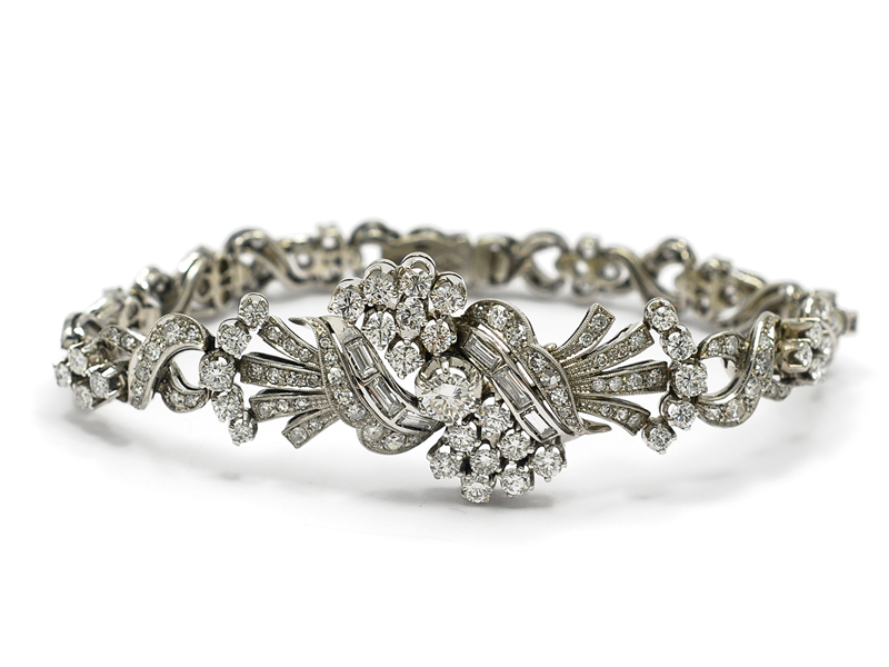 ARMBAND, 18K vitguld, briljant ca 0,45 ct, ca W/VS, briljant,- åttkantslipade och baguetteslipade diamanter ca 7,00 ctv, ca W/VS-P, ca 10 åttkantslipade och ca 8 briljantslipade är skadade, längd 18,5 cm, vikt 30,1 g.