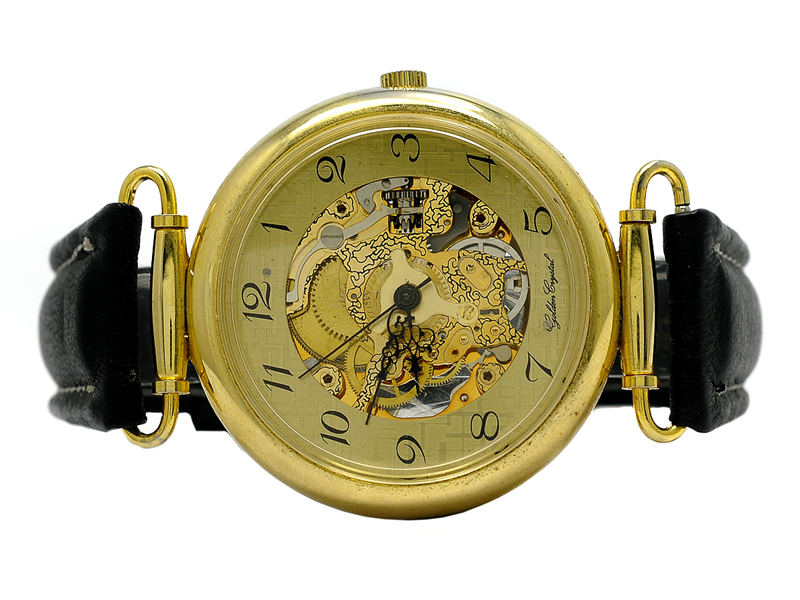 GOLDEN CRYSTAL, herrur, 45 mm, doublé, manuell, plexiglas, glasbaksida (skadat glas), skadad boett, läderband, ca 1985.