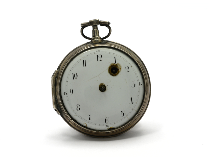 PECQUET ISAAC, Calais, fickur, 54 mm, Serie nr. 1231, nr. 6887, silver, spindelgång, nyckeldragare, glas + visare saknas, skadad urtavla, defekt, bucklor, ca 1800.