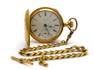 ELGIN, fickur, 54,5 mm, savonett, Serie nr. 14170319, Boett nr. 7603813, doublé, ankargång, skadad urtavla, defekt, motiv, mönster, monogram, ca 1909, kedja i gulmetall.