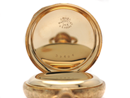 ELGIN NATL. WATCH Co. fickur, 53,5 mm (11 stenar, 18 size), Serie nr. 2783284, Boett nr. 39404, 14K guld, ankargång, skadad urtavla (7/10), innerlock i 14K guld, mönster, monogram, ca 1888.