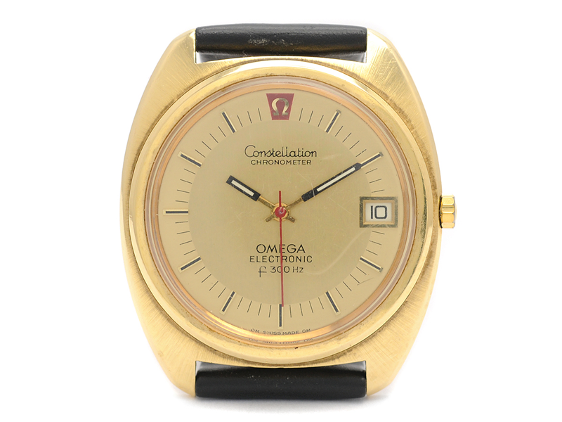 OMEGA, Constellation, Electronic (f 300 Hz), Chronometer, Cal 1250, Serie nr. 32891747, Ref nr. BA 198.002, Boett nr. 198.002, herrur, 38 x 36,5 mm, 18K guld, stämgaffel, plexiglas, datum, urtavla i guld, skadad urtavla (8/10), läderband, ca 1970.