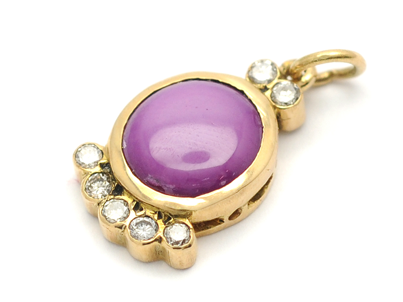 HÄNGE, 18K guld, syntetisk stjärnrubin, mindre skada, 7 briljanter ca 0,17 ctv, vikt 3 g.