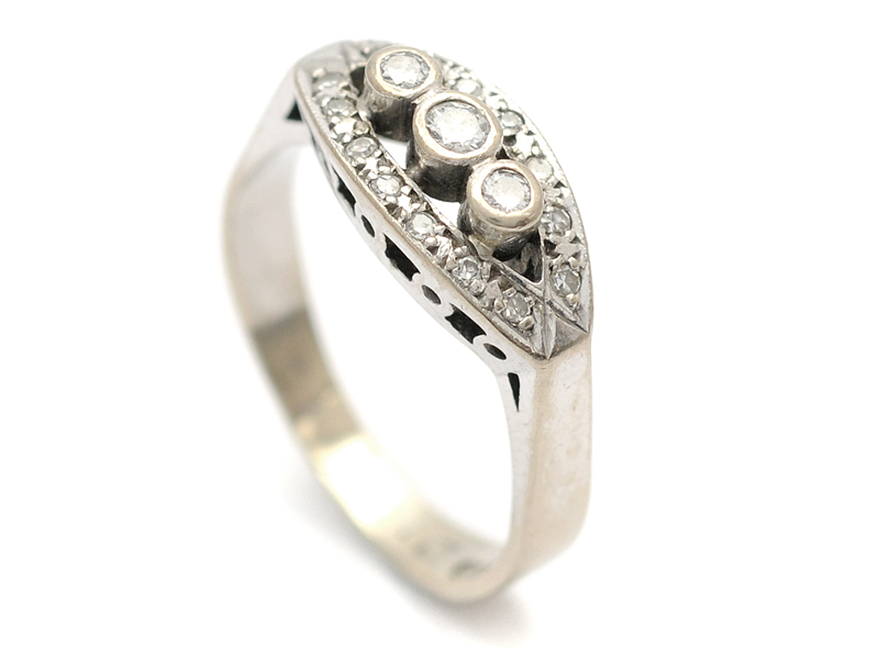 RING, 18K rodierat guld, briljanter 0,35 ctv enligt gravyr, ca W/VS, stl 17 mm, vikt 3,5 g, en av de mindre briljanterna är skad.