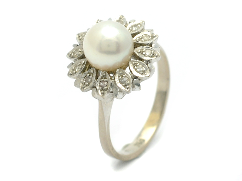 RING, 18K vitguld, odlad pärla, 12 åttkantslipade diamanter ca 0,08 ctv, stl 15,75 mm, vikt 4,6 g.