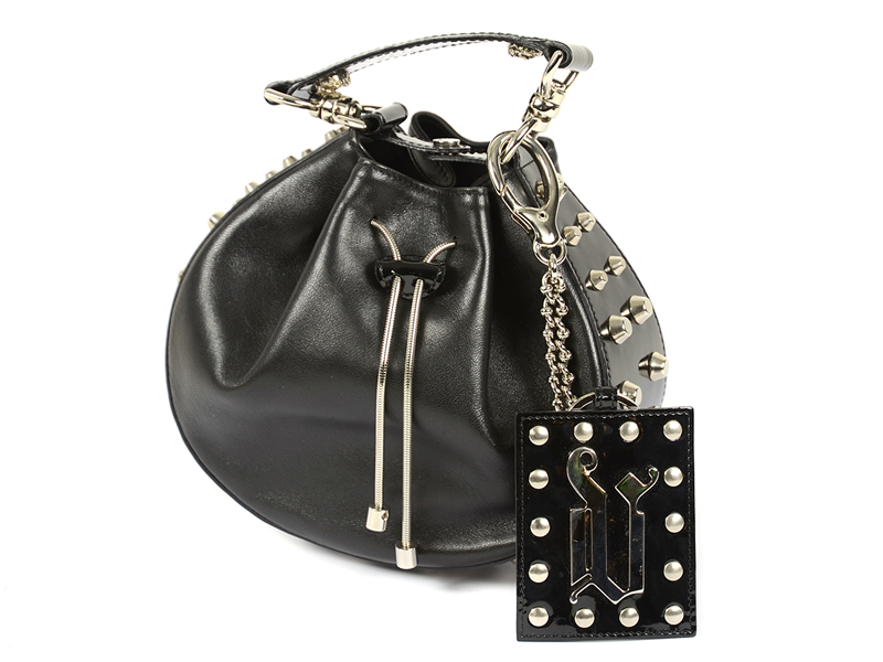 VÄSKA, VERSACE, liten väska i svart läder, skinnlack, vitmetalldetaljer, avtagbart väsksmycke, 18x16x9 cm, dustbag.