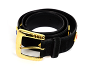 SKÄRP, ESCADA, vintage, svart mocka med gulmetalldetaljer samt nitar i rött, blått, bredd 4 cm, längd 75-85 cm.