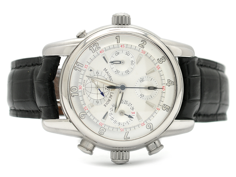 MAURICE LACROIX, Masterpiece Chrono Globe, Cal ML 88, Serie nr. AH 33983, Ref nr. MP6398-SS001-830, Boett nr. MP 6398, kronograf, herrur, 43 mm, stål, automatisk, safirglas (skadat), datum, två tidszoner, skadad urtavla, glasbaksida, läderband, viklås, ca 2008, box, ytterkartong.