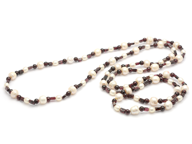 COLLIER, odlade sötvattenpärlor ca 8-9 mm, barocka, granater, längd ca 115 cm.