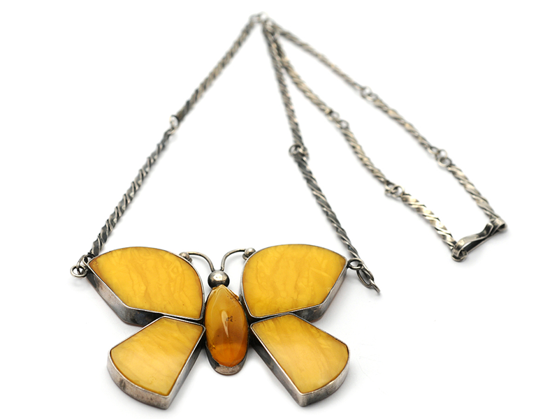 COLLIER, sterlingsilver, bärnsten, fjäril, längd 72 cm.