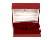 BOX, till Omega armbandsur, röd, 112 x 79 x 51 mm, skadad, ej komplett, ca 1970.
